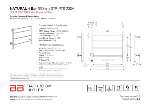 Bathroom Butler | NATURAL 4 Bar 650mm Straight Heated Towel Rail with PTSelect Switch (Polished Stainless Steel)